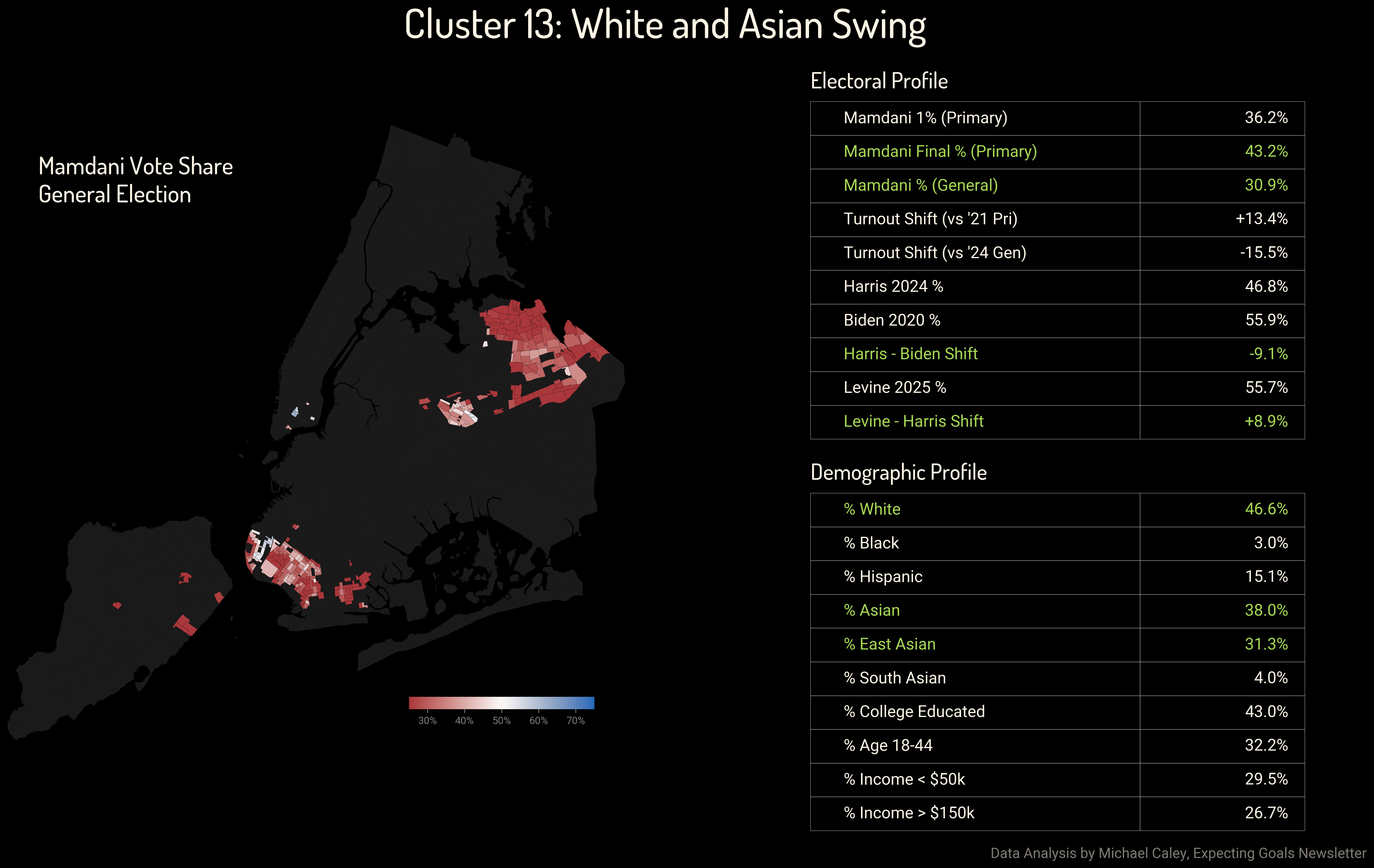 In some ways this is just a newsletter about how cool machine learning is. I put together a set of data with election results and census demographics by New York City election districts and I fed them into a “Gaussian Mixture Model” to create clusters of similar election districts, and of the 20 clusters it created, 15 had clear and coherent stories, and shockingly coherent geographies, despite the lack of geographic markers in the data. I merged two of the clusters into one group because they made more sense together than apart, and so that left me with 14.