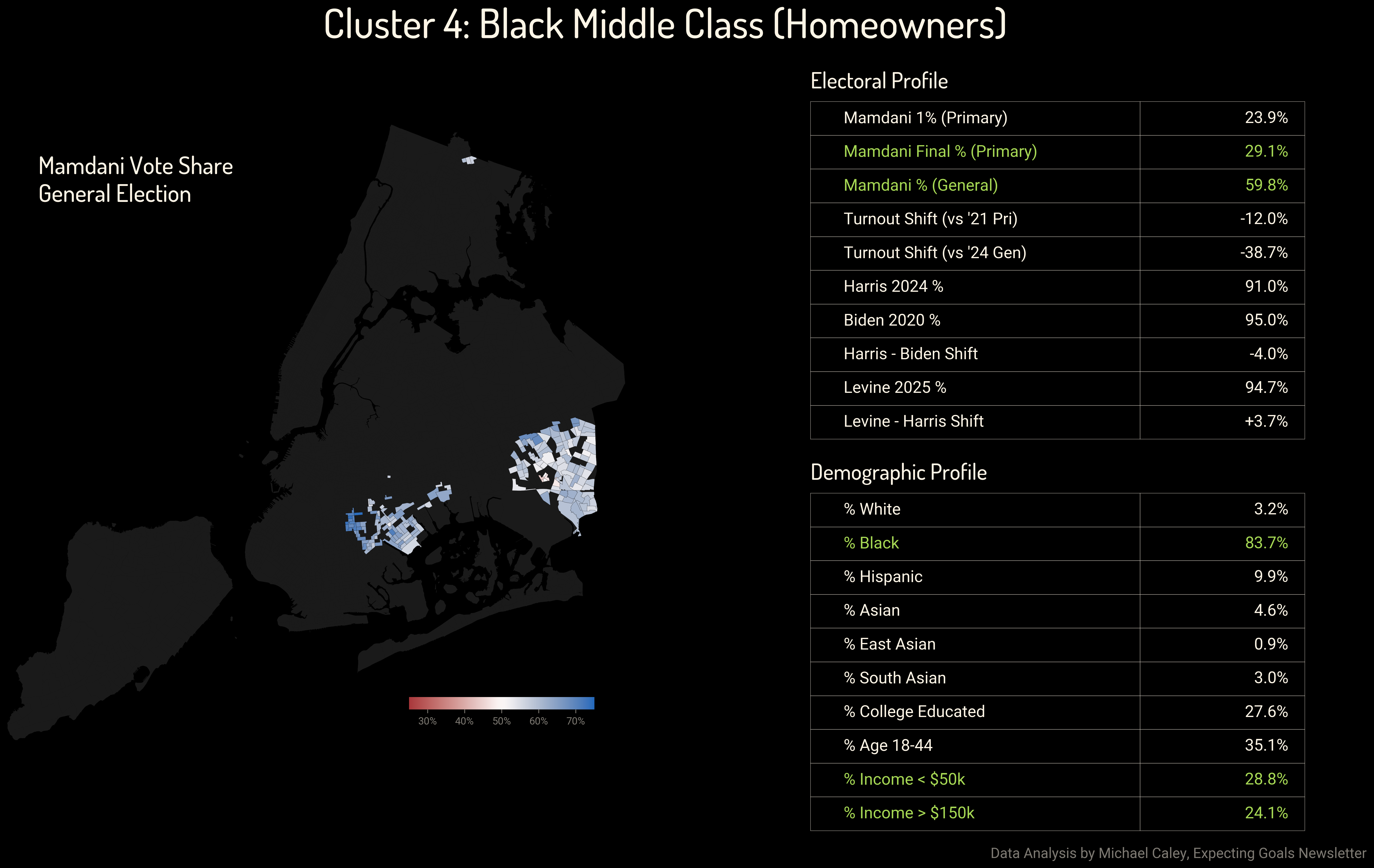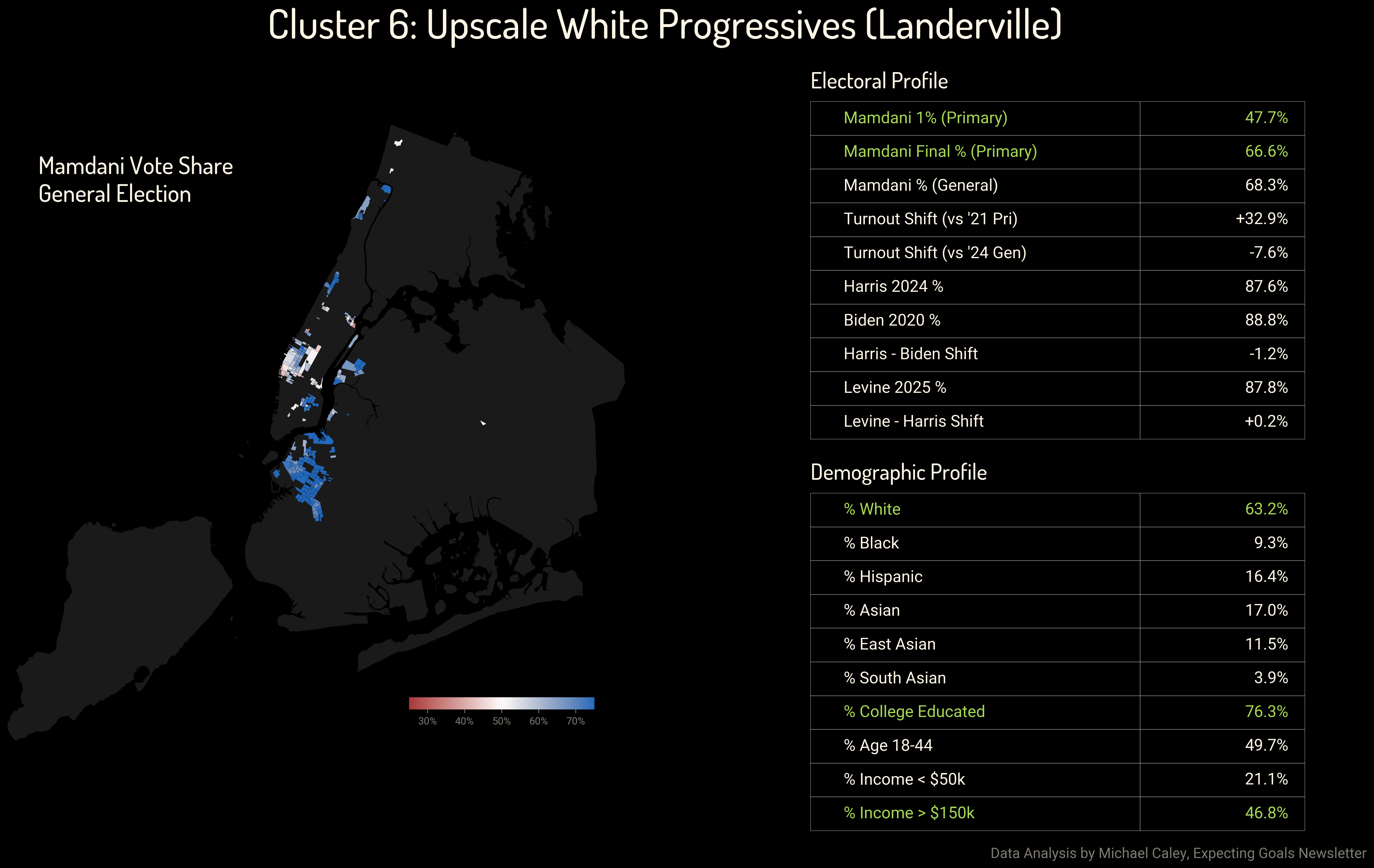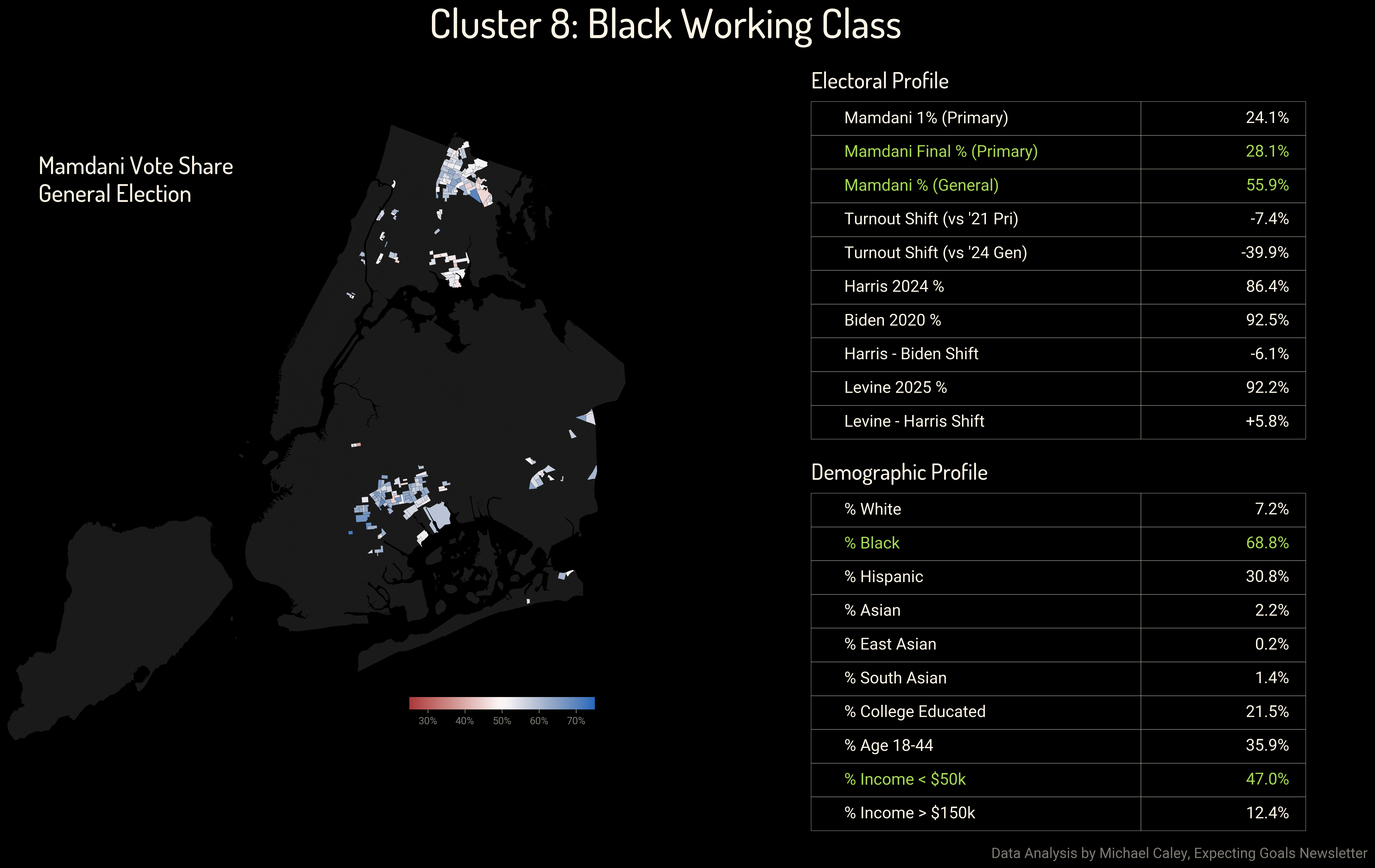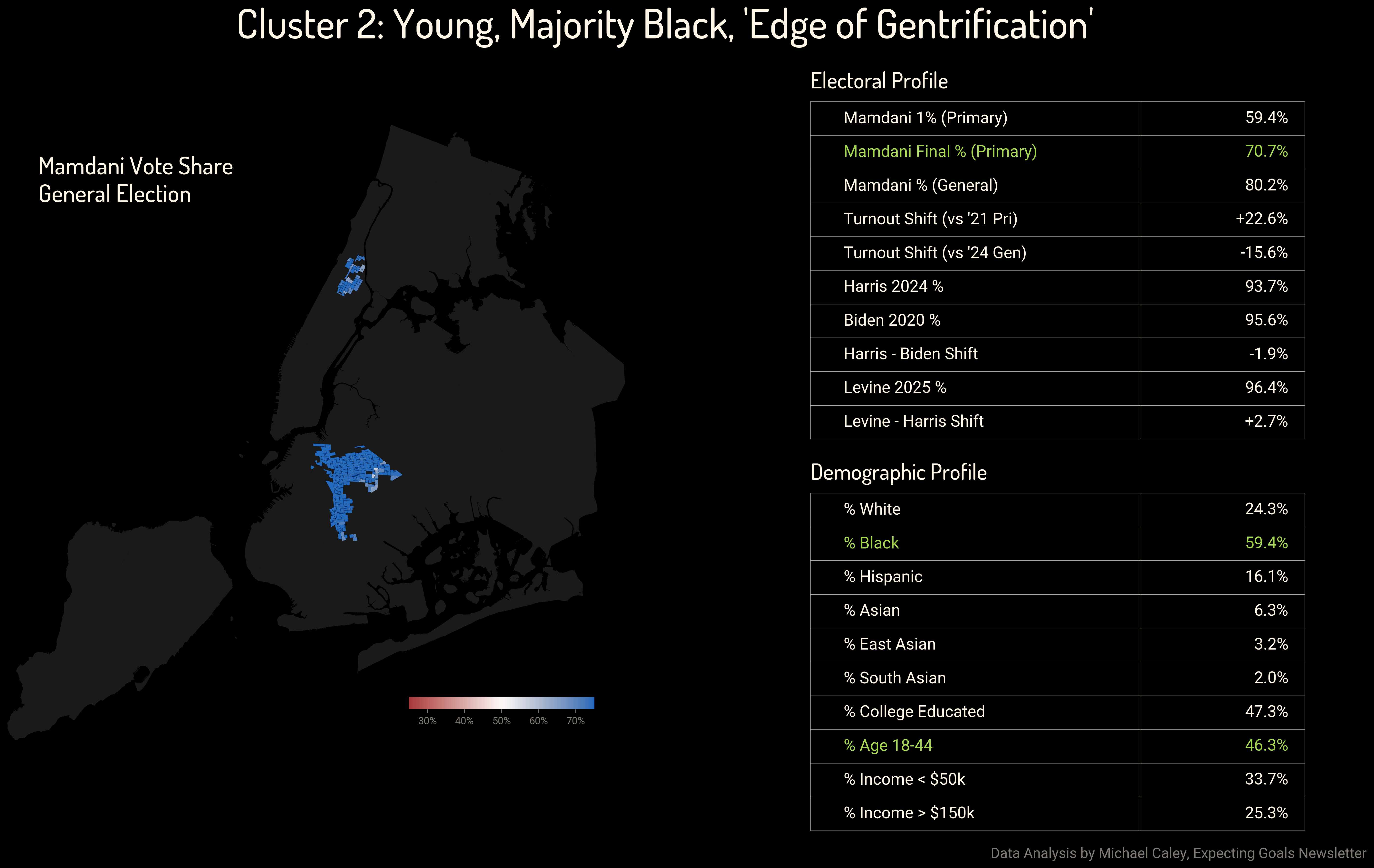 Mamdani put up margins of 60 points and more in these districts, amid surging voter turnout. This cluster also has the highest percentage of younger adults of any that the model identified. It is professional-class and highly educated but not exceptionally high-income. These are areas with multiple Democratic Socialist local representatives already, and it is hardly surprising they supported a DSA Mayoral candidate.
