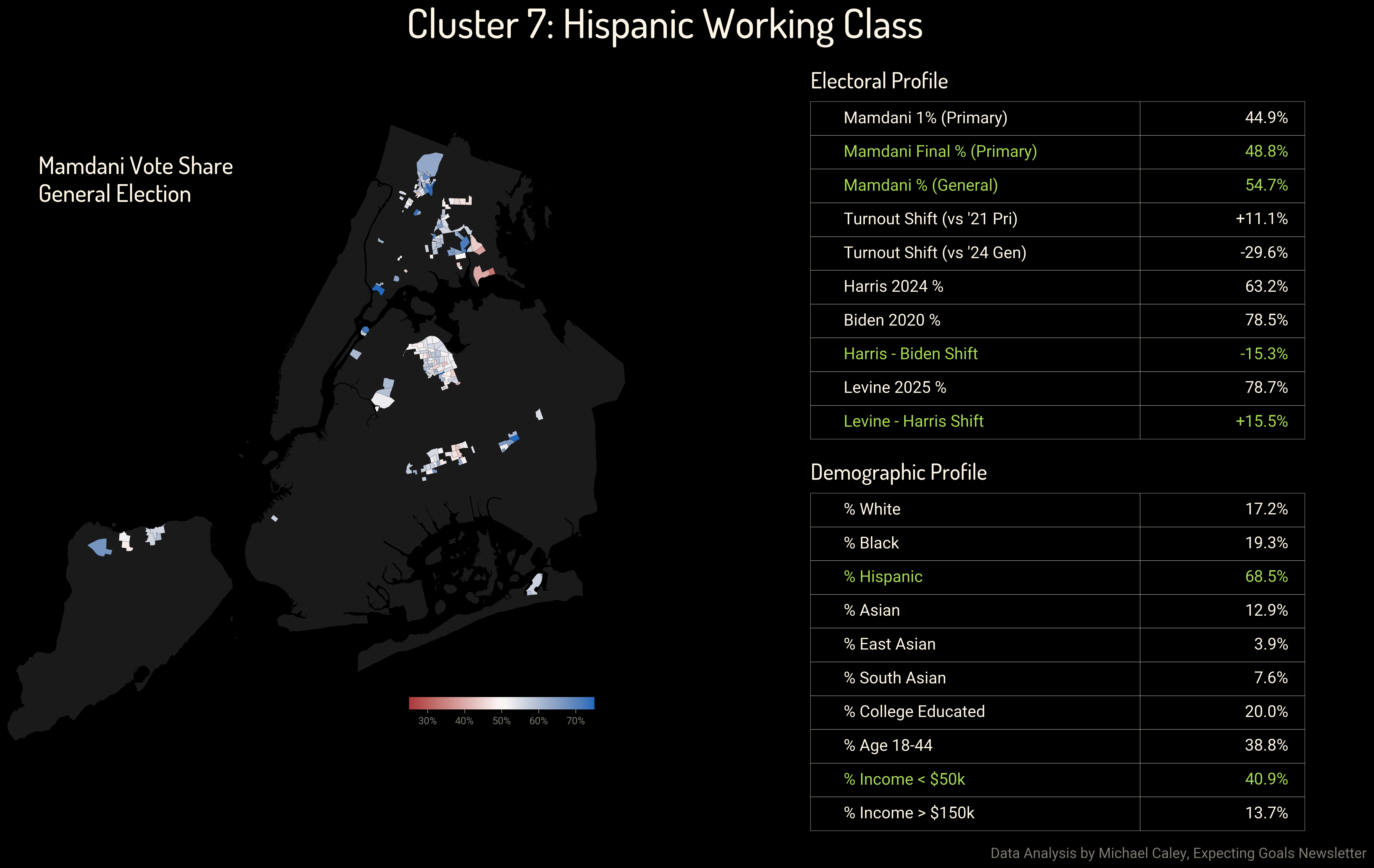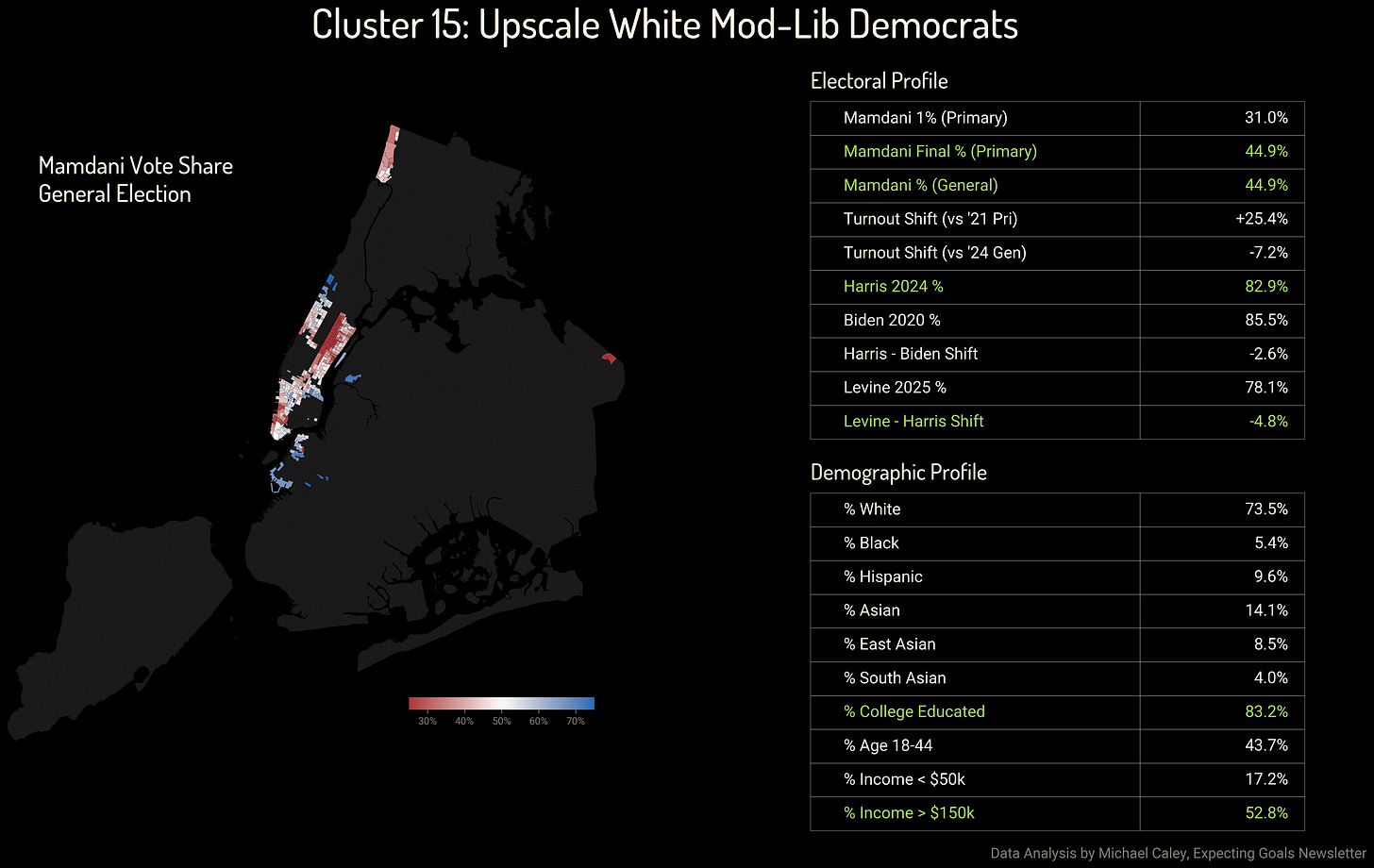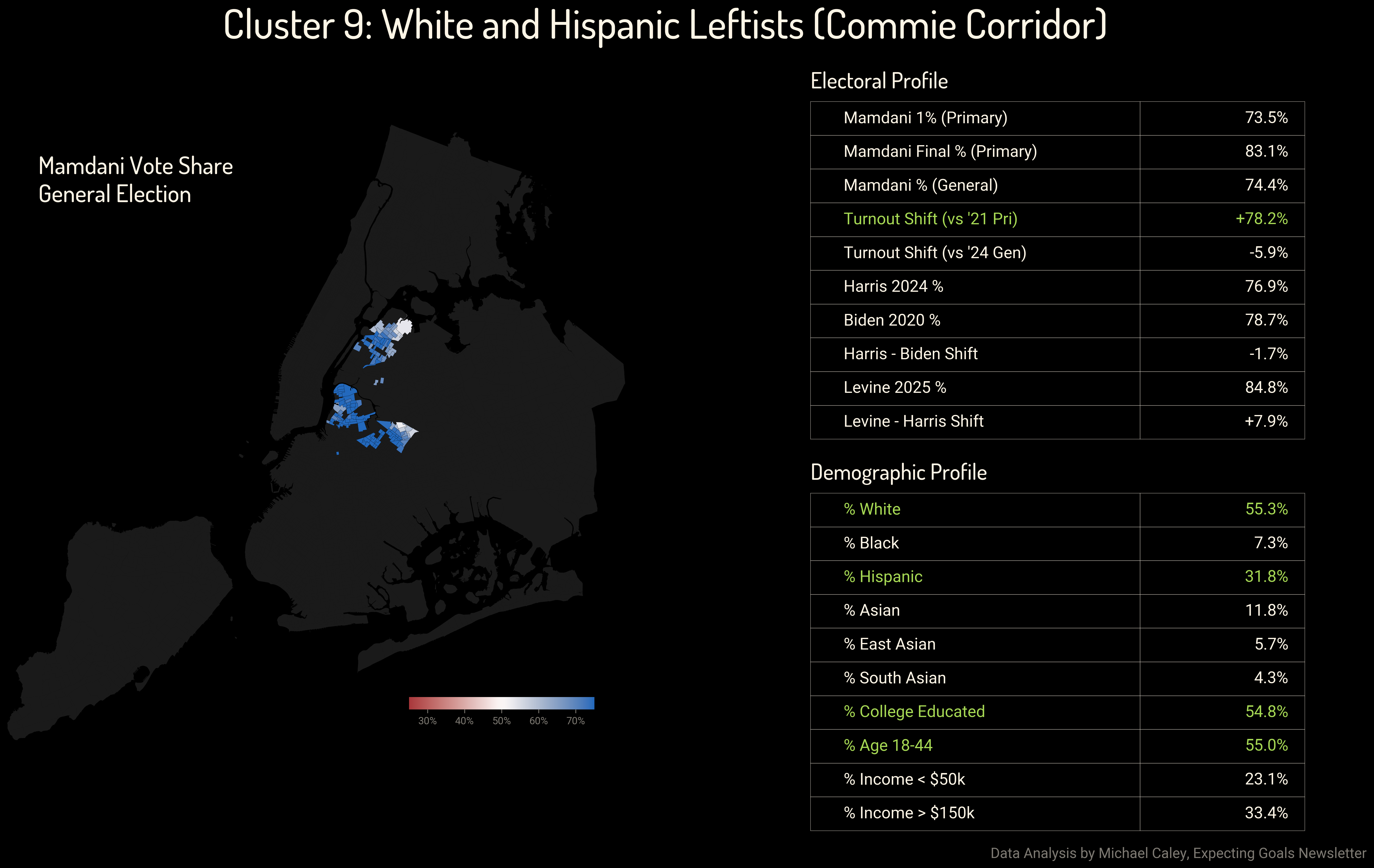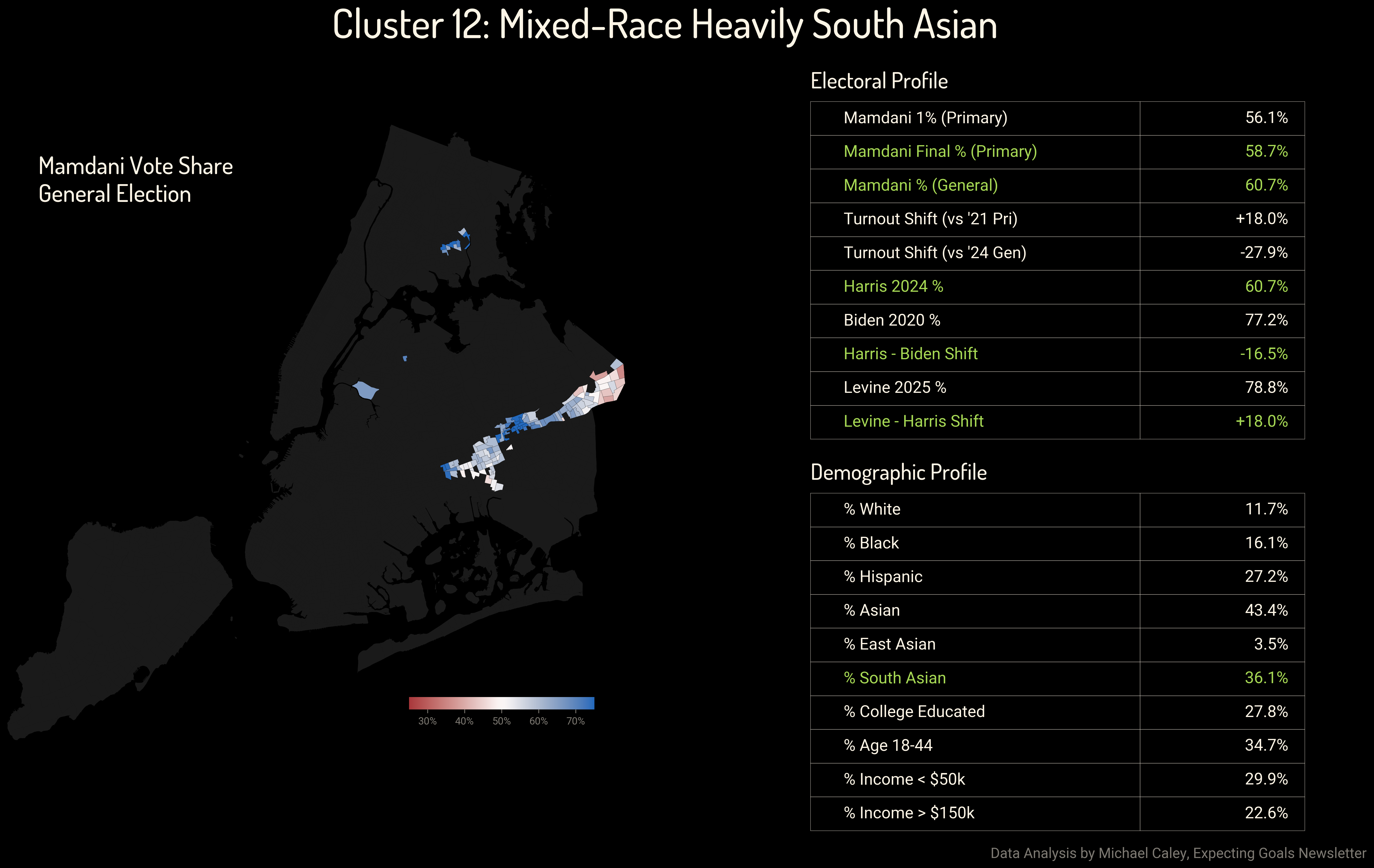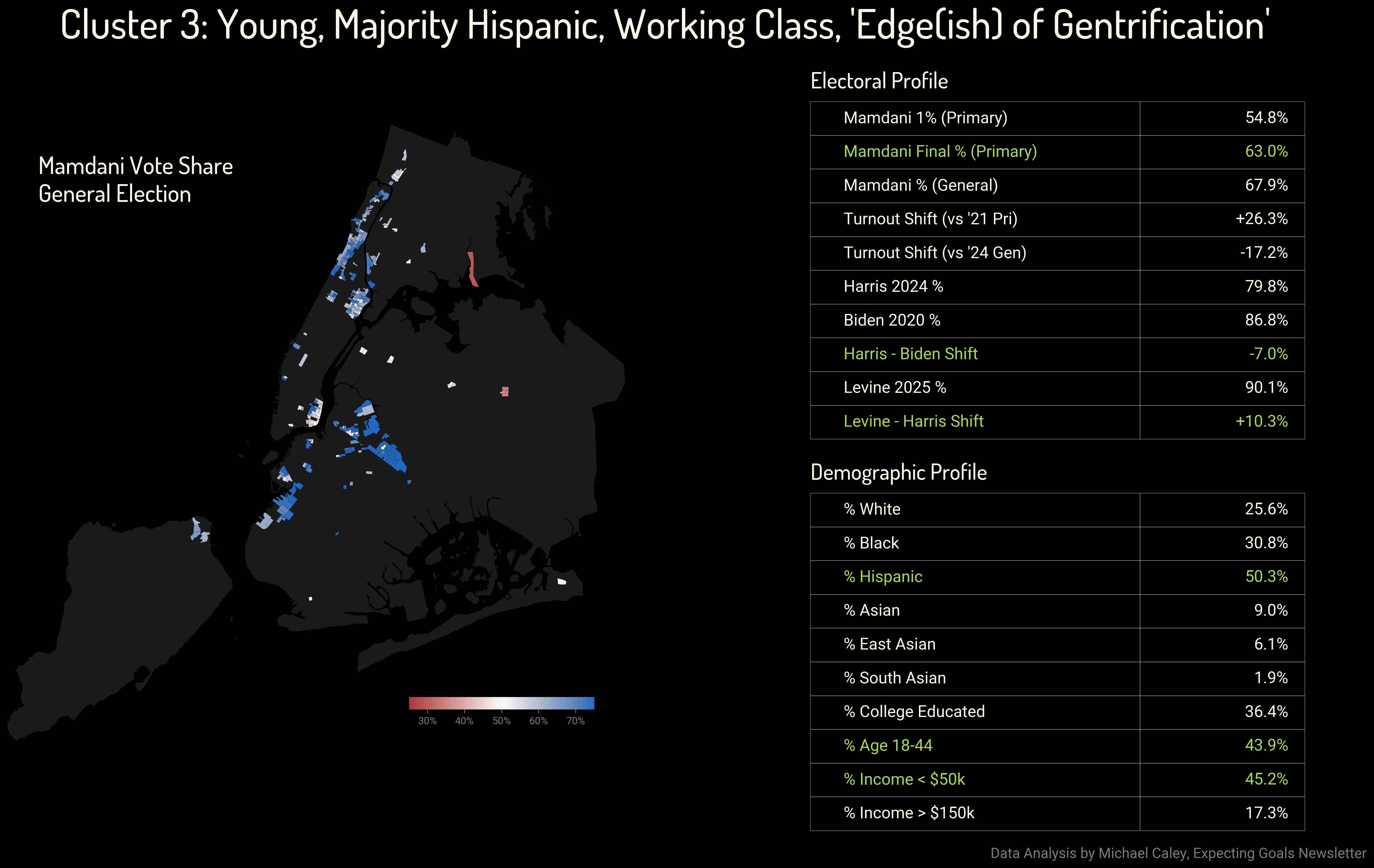 Mamdani put up margins of 60 points and more in these districts, amid surging voter turnout. This cluster also has the highest percentage of younger adults of any that the model identified. It is professional-class and highly educated but not exceptionally high-income. These are areas with multiple Democratic Socialist local representatives already, and it is hardly surprising they supported a DSA Mayoral candidate.
