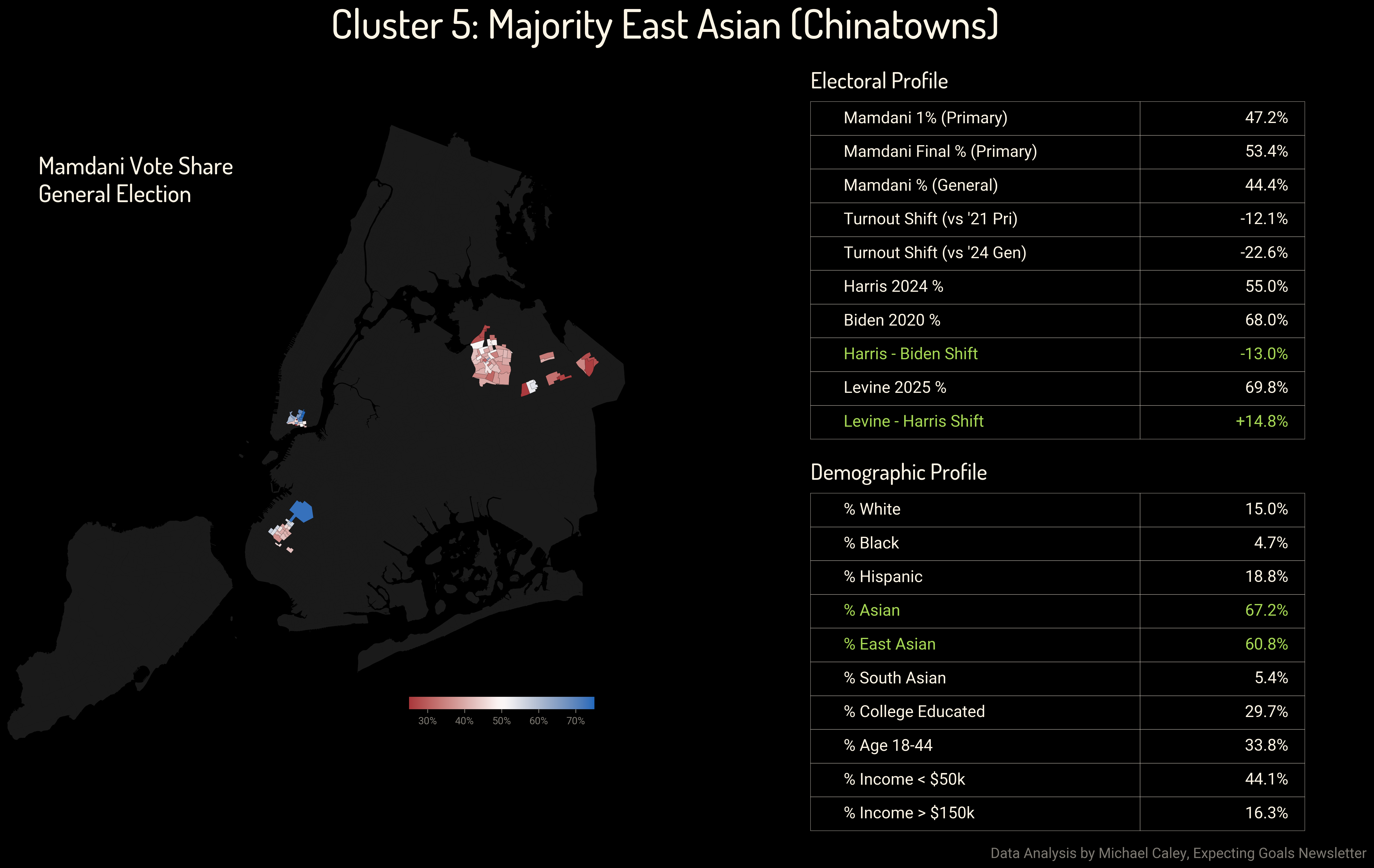 Mamdani actually won a small majority in the primary in Flushing, Sunset Park, and Manhattan Chinatown, but a more conservative general electorate made these swing regions in November. Here, strikingly, we see the same pattern of recent Democratic losses being reversed, but now in an area where Andrew Cuomo also received a large share of the vote. Voters in New York City’s Chinatowns were splitting their tickets, not supporting the Democratic nominee for Mayor but backing down-ballot Democrats like Mark Levine by high margins that hadn’t been seen in some years.
