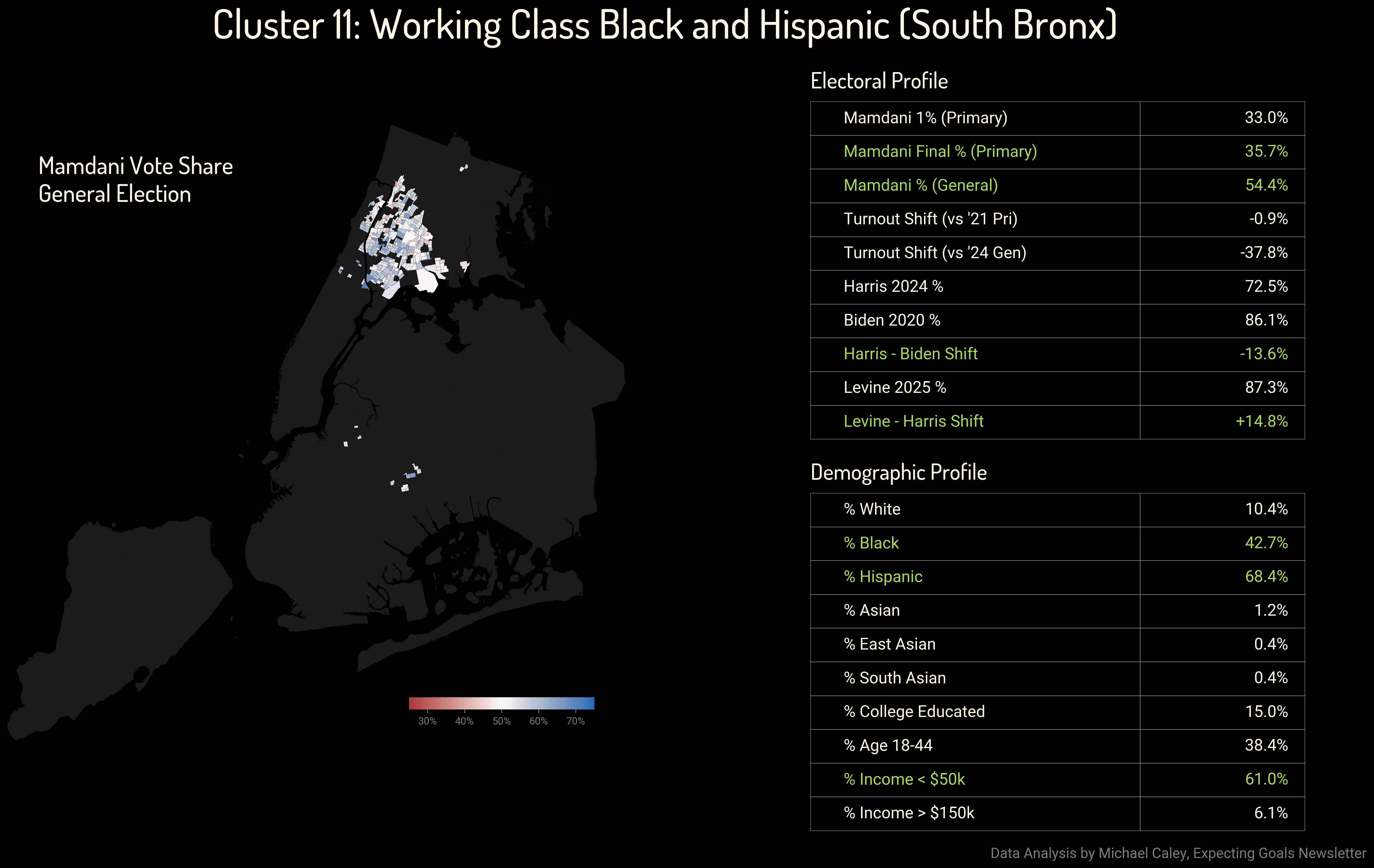 The black and Hispanic South Bronx, which contains many of the poorest neighborhoods in the city, tells a similar story about the Mayoral election as Mamdani gained about 20 points between the primary and the general.