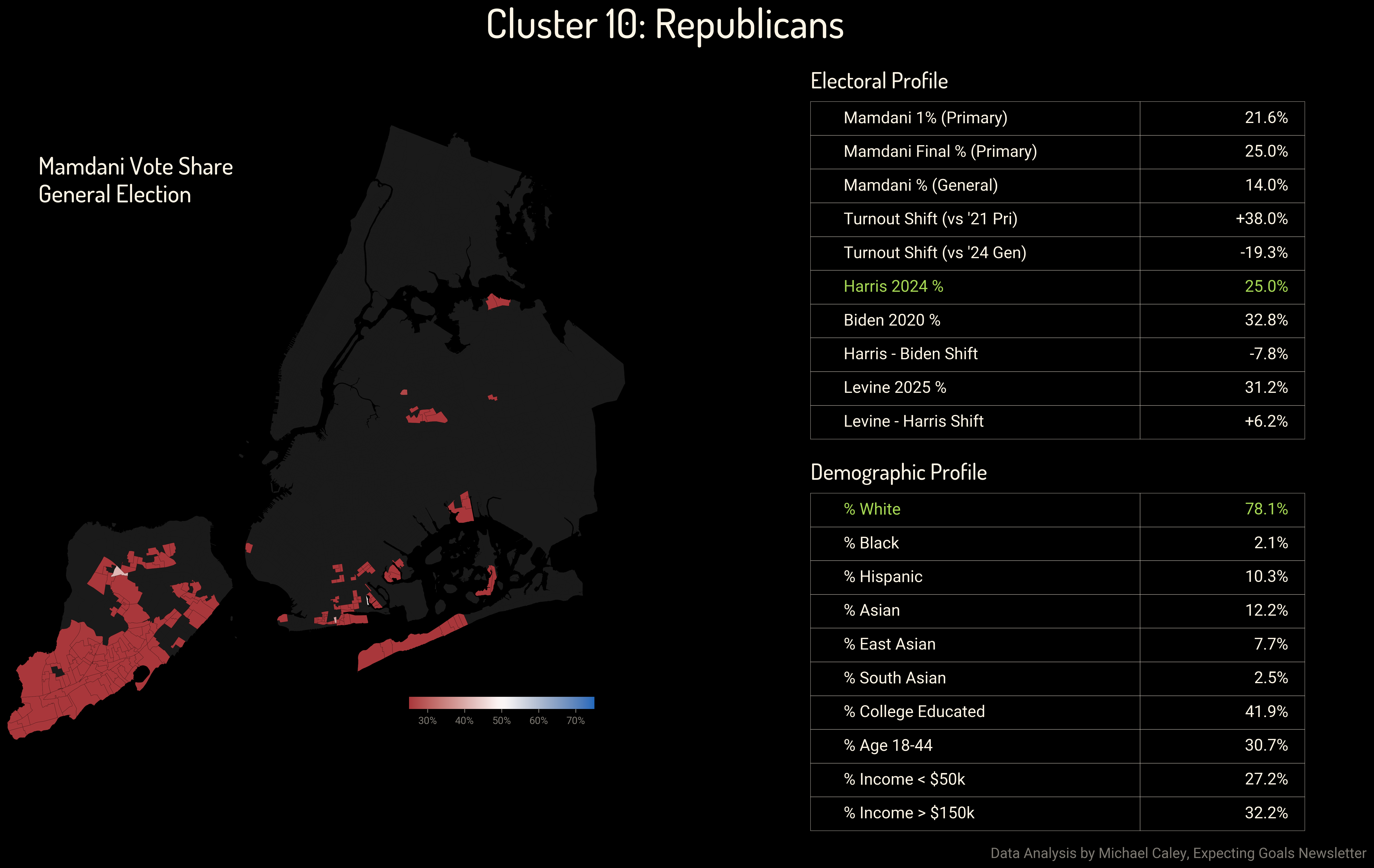 I’m sure there is much diversity in the many neighborhoods of Southern Staten Island, in Brighton Beach, Breezy Point, and other highly Republican areas. But the model saw Harris at 25 percent and lumped them all together. And for the purposes of looking at the 2025 election, this is correct. Republicans were motivated to vote against Zohran Mamdani and they did so by enormous margins.